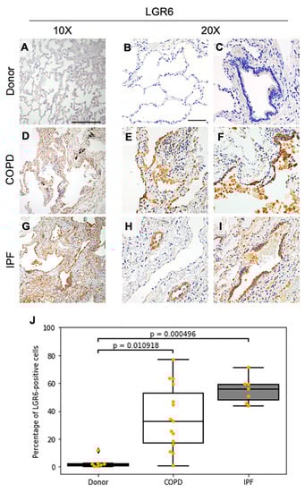 Overall, lung specimens from patients with COPD and IPF showed a significant increment in the number of LGR6-positive (LGR6+) cells when compared to donor tissues (Figure 1J; pdonor vs. COPD = 0.010918 and pdonor vs. IPF = 0.000496).