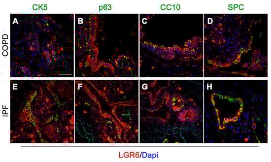 Increased LGR6 expression is observed in epithelial progenitor cells. (A–H): Immunofluorescence analyses depicted co-expression of LGR6 (red) and main epithelial progenitor markers (green). CK5 (A,E; bar = 50 μm) and p63 (B,F) markers were used to identify basal progenitors, CC10 stained club cells (C,G) and SPC was used to recognize ATII cells (E,H).