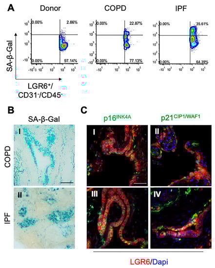 LGR6+ cells express increased levels of senescence-associated markers. (A,B) SA-β-Gal enzymatic activity was evaluated in donor, COPD and IPF cells isolated from freshly dissected lung biopsies (A). SA-β-Gal expression was confirmed in bronchoalveolar compartment of COPD and IPF tissues ((B); bar = 100 μm). (C) Representative photomicrographs showing co-expression of LGR6 in red with p16INK4A ((I)–(III)) and p21CIP1/WAF1 ((II)–(IV)) in green in the bronchoalveolar compartment of COPD and IPF patients ((C); scale bar = 50 μm).