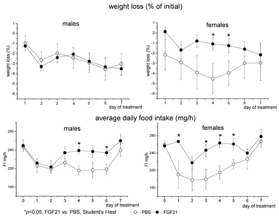 Each result is presented as an arithmetic mean ± SE for the sample size (i.e., number of mice) indicated. Repeated measures ANOVA with factors “sex” (male, female), “experiment” (PBS, FGF21 administration), and “days of experiment” (7) were used to analyze FGF21 effects on food intake (FI) and body weight (BW) loss. Three-way ANOVA with factors “sex”, “experiment”, and “day of experiment” (1–7) was used to analyze FGF21 effects on locomotor activity. Two-way ANOVA with factors “sex” and “experiment” was used to analyze FGF21 effects on weights of body, liver, fat, and iBAT, blood parameters, and gene expression with multiple comparisons using the post hoc Newman–Keuls test. The comparisons between single parameters were performed with a two-tailed Student’s t-test and nonparametric Mann–Whitney U test. Results were considered significant at p < 0.05. The STATISTICA 6 software package (StatSoft, TIBCO Software Inc., Palo Alto, CA, USA) was used for analysis.
