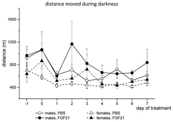 Male and female mice differed in locomotor activity. Males ran a greater distance than females during both the whole day and the dark phase of the day (p < 0.001, 3-way ANOVA, Figure 2). FGF21 administration increased locomotor activity in both males and females (p < 0.05, 3-way ANOVA, Figure 2). Therefore, FGF21 administration did not affect BW and increased locomotor activity and FI in obese Ay mice regardless of sex.