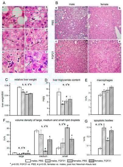 In PBS-treated mice, the absolute and relative weight of the liver, as well as the content of fat in the liver, were significantly higher in males than in females (Table 1, Figure 3B(a,b),C,D), and hepatic glycogen stores were the same (data are not shown). These data, combined with the results for the hepatocyte lipid accumulation, indicate that males had more pronounced liver steatosis than females in the PBS treated groups. At the same time, females had more macrophages and apoptotic bodies (Figure 3E,G).