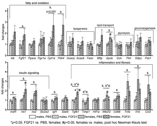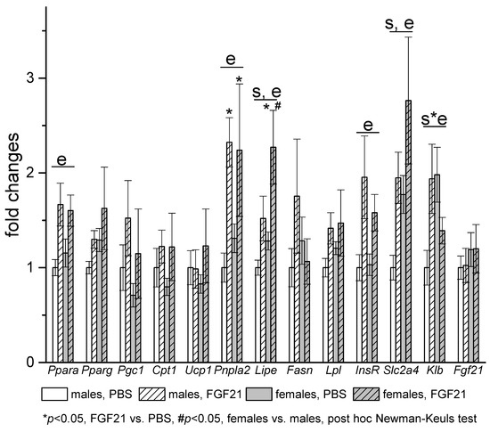 Influence of FGF21 administration on liver gene expression in obese Ay male and female mice. Data are presented as mean ± SE. Mice were administered FGF21 for 7 days. Significant influence (p < 0.05) of factors “e” (administration of PBS or FGF21), “s” (sex), and “s*e”, two-way ANOVA, are indicated in the plot.