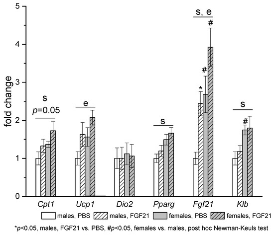 Influence of FGF21 administration on iBAT gene expression in obese Ay male and female mice. Data are presented as mean ± SE. Mice were administered FGF21 for 7 days. Significant influence (p < 0.05) of factors “e” (administration of PBS or FGF21), “s” (sex), two-way ANOVA are indicated in the plot.