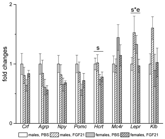 Influence of FGF21 administration on hypothalamic gene expression in obese Ay male and female mice. Data are presented as mean ± SE. Mice were administered FGF21 for 7 days. Significant influence (p < 0.05) of factors “s” (sex) and “s*e” where “e” is the administration of PBS or FGF21, two-way ANOVA are indicated in the plot.