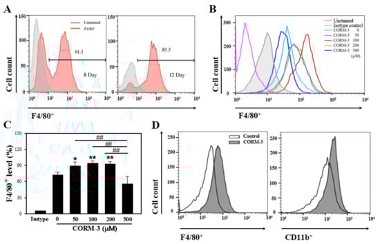 CORM-3 enhances macrophage differentiation. Murine BMCs were differentiated with 30 ng/mL M-CSF for 8–12 days to induce macrophage differentiation and cells were acquired on FACSCalibur. (A) Representative flow cytometry of F4/80-positive cells on days 8 and 12 (n = 3). (B,C) BMCs were treated with 0–500 μM CORM-3 in the presence of 30 ng/mL M-CSF on day 5 and incubated for 5 days. F4/80-positive cells were analyzed on FACSCalibur (n = 3). Results were presented as mean ± SD, * p < 0.05, and ** p < 0.01 compared to 0 μM CORM-3, and ## p < 0.01 between groups compared (one-way ANOVA). (D) BMCs were treated with 100 μM CORM-3, and F4/80-positive and CD11b-positive cells were analyzed on FACSCalibur (n = 34).