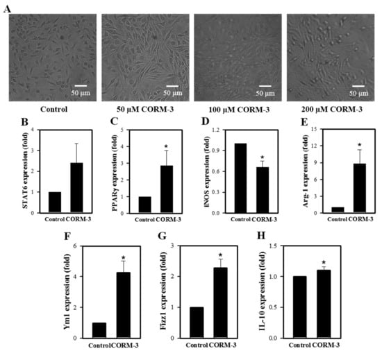 CORM-3 increases genes and molecules involved in M2 polarization but decreases iNOS expression. Murine BMCs were treated with CORM-3 on day 5 in the presence of 30 ng/mL M-CSF and incubated for 5 days to induce macrophage differentiation. (A) Representative pictures of cells treated with 0–200 μM CORM-3 (n = 3). (B–H) The mRNA expression levels of STAT6, PPARγ, iNOS, Arg-1, Ym1, Fizz1, and IL-10 were determined by qRT-PCR (n = 3). GAPDH was used as an internal reference. Results are presented as mean ± SD, * p < 0.05 compared to control (Student’s t-test).