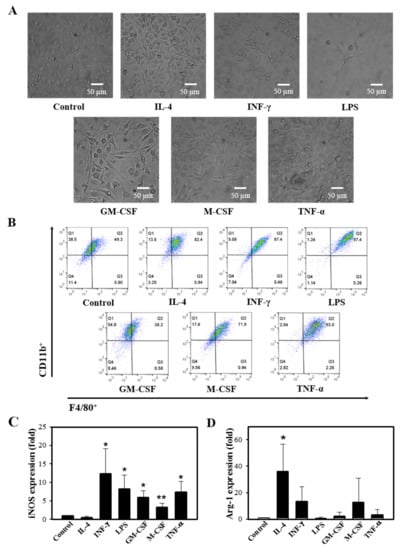 Different ligands induce M1/M2 polarization. Murine BMCs were treated with a variety of stimuli, such as 10 ng/mL IL-4, 50 ng/mL IFN-γ, 10 µg/mL LPS, 10 ng/mL GM-CSF, 30 ng/mL M-CSF, and 10 ng/mL TNF-α in the presence of 30 ng/mL M-CSF on day 5, followed by 5 days of incubation. (A) Cell images after 10 days of differentiation were acquired (n = 4). (B) Representative flow cytometry of cells in response to stimuli, X axis: F4/80+, Y axis: CD11b+ (n = 3). (C,D) Relative gene expressions of iNOS and Arg-1 by the M1/M2 modulating stimuli were determined by qRT-PCR (n = 3). Results are presented as mean ± SD; * p < 0.05 and ** p < 0.01 compared to control (Student’s t-test).