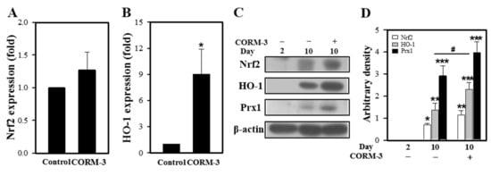 Since CO induces HO-1 expression through Nrf2 activation [], we determined the effect of CORM-3 on HO-1 expression. Expressions of Nrf2 and HO-1 mRNA were increased by CORM-3 treatment (Figure 4A,B). HO-1 protein expression was negligible in BMCs at day 2 and increased in differentiated macrophages at day 10; treatment with CORM-3 further increased the HO-1 expression and Prx1 expressions (Figure 4C,D), indicating that exogenous CO upregulates Nrf2 and HO-1 and the increased HO-1 produces more CO, which further stimulates macrophage differentiation and M2 polarization. In addition, inactive CORM-3 (iCORM-3) was prepared by dissolving CORM-3 in PBS and allowing liberation of CO for 24 h at 20–23 °C []. Treatment cells with iCORM-3 did not affect HO-1 expression (data not shown), reflecting that the HO-1 induction observed with CORM-3 was a result of released CO.