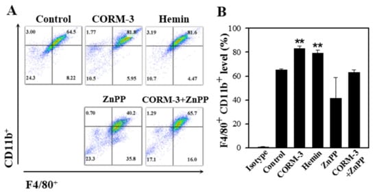 To determine the effect of endogenous CO on macrophage differentiation, BMCs were treated with either an HO-1 inducer (hemin) or an HO-1 inhibitor (ZnPP). The concentrations of hemin and ZnPP used in this experiment did not affect cell viability as measured using the MTT assay (Figure S2). Treatment with hemin increased the F4/80-positive and CD11b-positive cell populations, but ZnPP suppressed the macrophage differentiation (Figure 5). Moreover, combined treatment of CORM-3 with ZnPP suppressed the macrophage differentiation, suggesting that macrophage differentiation is tightly regulated by the CO availability. Along with the results shown in Figure 4, these results indicate that HO-1 expression increases during macrophage differentiation, and the increased HO-1 produces more CO, which further stimulates macrophage differentiation.