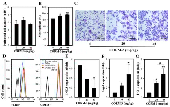CO enhances M2 polarization in vivo. Mice were injected with 3% thioglycollate followed by CORM-3, and peritoneal exudate cells were collected. (A) The number of total peritoneal exudate cells was counted. (B) The proportion of macrophages in peritoneal exudates was determined after Diff-Quik staining, and (C) the representative images of peritoneal exudate cells. (D) Peritoneal exudate cells were stained with antibodies F4/80-FITC and CD11b-PE and analyzed using FACSCalibur. (E–G) The mRNA expressions of iNOS, Arg-1, and HO-1 were determined by qRT-PCR. Results are presented as mean ± SD (n = 3); * p < 0.05 and ** p < 0.01 compared to control and # p < 0.05 between groups compared (one-way ANOVA).