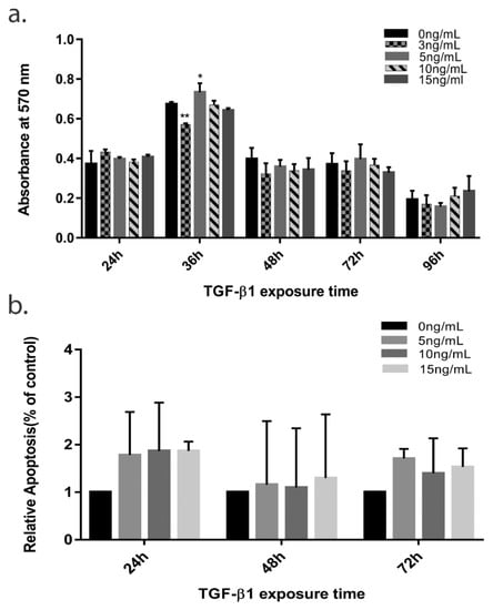 Cultures that reached 50–70% confluence in flasks were serum starved for 24 h, followed by treatment with TGF-β1 (T7039, Sigma Aldrich, St. Louis, MO, USA) at different concentrations (3 ng/mL, 5 ng/mL, 10 ng/mL, 15 ng/mL) for 24 h, 36 h, 48 h, 72 h, and 96 h while one set, that was left untreated, was used as control. Cell viability in control and treated cells was measured using the 3-(4,5-dimethylthiazol-2-yl)-2,5-diphenyltetrazolium bromide (MTT, Sigma-Aldrich, St. Louis, MO, USA) assay using a previously described procedure [14]. Cells were serum starved for 24 h and then treated with or without TGF-β1 (3 ng/mL, 5 ng/mL, 10 ng/mL, 15 ng/mL) for 24 h, 36 h, 48 h, 72 h, and 96 h. Absorbance at 570 nm was measured on an EPOCH microplate reader (BioTek, Winooski, VT, USA).