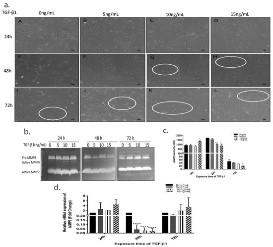TGF-β1 induces morphological changes and effects functional activity of MMP9. (a) Panel (A)–(L) depicts representative photomicrographs of TM cells after TGF-β1 treatment. Circles show flattened, elongated, spindle shaped morphology of TM cells representing EMT. Bar = 50 µM. (b) MMP9 activity visualized by gelatin zymography (c) Quantification of MMP9 activity in arbitrary units using ImageJ, (d) relative mRNA expression of MMP9 gene after TGF-β1 treatment. The error bars represent standard deviation (* p < 0.05, ** p < 0.01, **** p < 0.0001, by one way ANOVA).