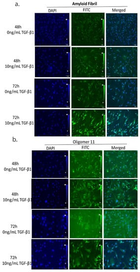 Control and treated cells were seeded in coverslips coated with 0.1% gelatin before TGF-β1 treatment for this experiment. The cell culture medium was separated, and the cells were washed in PBS followed by fixation with 4% paraformaldehyde for 15 min at room temperature (RT). Permeabilization of the cells was done with 0.2% Triton X-100 solution for 10 min followed by incubation with blocking solution (5% FBS in 1X PBS) for 20 min at RT with gentle rocking to block non-specific sites. Cells were then incubated with primary antibodies, Oligomer 11 (AHB0052, 1:1500, Invitrogen, Beverly, MA, USA) and amyloid fibril (PA5-77843, 1:1500, Invitrogen, Beverly, MA, USA) overnight at 4 °C, followed by incubation with secondary antibody (anti-rabbit alexa 488 1:2000, Invitrogen, Beverly, MA, USA) mixed with 2 µg/mL Hoechst (for nucleus staining) for 1 h at RT. The coverslips were mounted and observed under fluorescent microscope (Olympus, BX53, Tokyo, Japan).