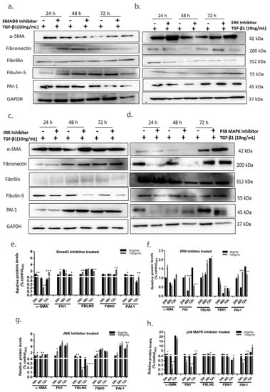To elucidate the signaling pathways involved for pro-fibrotic changes and EMT we further treated the cells with TGF-β1 (10 ng/mL) with and without various canonical and non-canonical TGF-β1 inhibitors. SIS3 which inhibits the Smad3 signalling pathway (phospho smad3 levels were ana-lysed to confirm involvement of Smad signalling pathway, see Figure S5) caused reduced TGF induced fibronectin expression, whereas expression of other ECM proteins did not change significantly with SMAD3 inhibition. While EMT changes (characterized by changes in α-SMA levels and morphological transformation) was prevented at 48 h following treatment of Smad3, ERK and p38 MAPK inhibitors, (Figure 5). JNK inhibition had no effect on α-SMA levels or other fibrotic markers. Inhibition of non-canonical pathways including ERK causes reduced expression of fibronectin and fibrillin with JNK inhibition being the sole pathway causing reduced Fibulin-5 expression. These results suggest that the expression of downstream pro-fibrotic markers involves a complex regulation by both canonical and non-canonical pathways regulating different proteins.