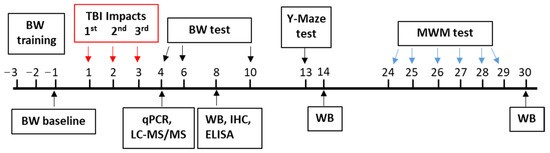 Schematic diagram of the experimental designs. The red arrows represent the days when the first, second, and third TBI was delivered. The repetitive closed head injury was established using an electromagnetic controlled stereotaxic impact device. BW, beam walk; qPCR, quantitative polymerase chain reaction; LC-MS/MS, liquid chromatography with tandem mass spectrometry; WB, western blot; IHC, immunohistochemistry; ELISA, enzyme-linked immunoassay; MWM, Morris water maze.