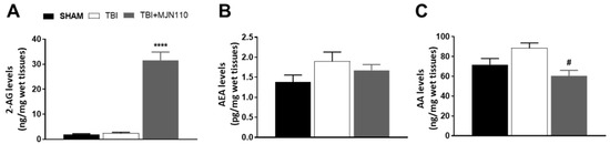 Administration of MJN110 elevated the brain levels of 2-AG and reduced the production of AA in TBI mouse brain. Fresh ipsilateral mouse cortical tissues on day 4 post-TBI were subjected to LC-MS/MS analysis. (A) 2-AG levels were significantly increased in the MJN110 (2.5 mg/kg)-treated group compared to the sham and TBI/vehicle groups (**** p < 0.0001). (B,C) Levels of AEA and AA were examined by LC-MS/MS, and the production of AA was reduced by MJN110 treatment (# p < 0.05 vs. TBI/vehicle group). (n = 5 animals in each group; bars represent means ± SEM).
