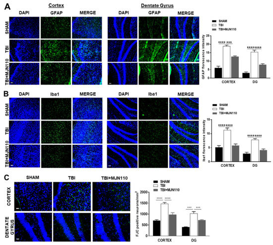 MJN110 treatment reduced glial cell accumulation and neuronal death in the ipsilateral cortex and dentate gyrus of TBI mouse brain. At 8 days post-injury, the (A) GFAP-, (B) Iba1- and (C) FJC-positive immunostainings were significantly increased in the ipsilateral cortex and dentate gyrus (DG) of the TBI mouse brain, and these changes were attenuated by MJN110 (2.5 mg/kg) treatment. (*** p < 0.001 and **** p < 0.0001; n = 3 animals in each group. Bars represent means ± SEM, and the scale bar is equal to 50 μm). DAPI, 4′,6-diamidino-2-phenylindole; GFAP, glial fibrillary acidic protein; FJC, Fluoro-Jade C.