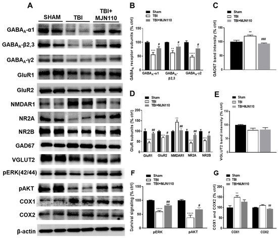 MJN110 treatment restored the altered expression of the ionotropic glutamate and GABA receptor components and the survival signaling molecules in the TBI mouse hippocampus. At 8 days post-TBI, the expression of GABAA-α1, GABAA-β2,3, GABAA-γ2, GluR1, GluR2, NR2A, NR2B, pERK and pAKT in the ipsilateral hippocampal tissues was significantly reduced in the TBI vehicle group, and reversed by the MJN110 (2.5 mg/kg) treatment (A,B,D,F). The expression of GAD67 and NMDAR1 was upregulated in the TBI/vehicle group and reduced by the MJN110 treatment (A,C,D). There were no changes in the expression of VGLUT2 in all the experimental groups (E). The expression of COX-1, but not COX-2 was increased in the TBI/vehicle group (G). (** p < 0.01, *** p < 0.001, and **** p < 0.0001 comparison between sham and TBI/vehicle; # p < 0.05, ## p < 0.01 and ### p < 0.001 comparing TBI/vehicle vs. TBI + MJN110 groups. n = 5 animals in each group). Bars represent means ± SEM).