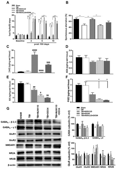 To further validate the therapeutic effect of MJN110 is attributable to the elevated brain levels of 2-AG, we utilized a recently developed DAGL inhibitor, DO34, to block the 2-AG synthesis [29]. TBI animals were treated with DO34 (30 mg/kg), MJN110 (1 mg/kg) and their combination once a day for 7 days. Inhibition of DAGLα and DAGLβ by DO34 reversed the therapeutic effect of MJN110 on locomotor function and working memory in both beam walk and Y-maze tests, whereas treatment with DO34 alone did not have any effect (Figure 9A,B). To assess the selectivity of systematically administered DO34 in the mouse brain, 2-AG, AEA and AA levels were measured in the ipsilateral cortex at 4 days post-TBI using LC-MS/MS. We found that DO34 treatment almost completely blocked the synthesis of 2-AG and the elevated levels of 2-AG by MJN110 were significantly reduced (Figure 9C). Notably, there was no change in the levels of AEA among the groups (Figure 9D). TBI per se did not affect the levels of AA compared to the sham group, but treatment with DO34 or its combination with MJN110 significantly reduced AA levels (Figure 9E). The levels of PGE2 in the TBI mouse brain was also significantly reduced by DO34 and its combined treatment with MJN110 (Figure 9F). Treatment with MJN110 also normalized the expression of GABAA -β2, 3, GABAA -γ2, GluR1, GluR2, NR2A, NR2B and NMDAR1 receptor subunits in hippocampal tissue lysates at 14 days post-TBI and these changes were mostly reversed by co-treatment with DO34. Treatment with DO34 alone did not have any effect on the altered expression of these inotropic receptor subunits in the TBI mouse hippocampus (Figure 9G).