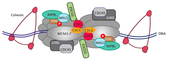 - Ivanov, M.P.; Ladurner, R.; Poser, I.; Beveridge, R.; Rampler, E.; Hudecz, O.; Novatchkova, M.; Hériché, J.; Wutz, G.; van der Lelij, P.; et al. The replicative helicase MCM recruits cohesin acetyltransferase ESCO2 to mediate centromeric sister chromatid cohesion. EMBO J. 2018, 37. [Google Scholar] [CrossRef]