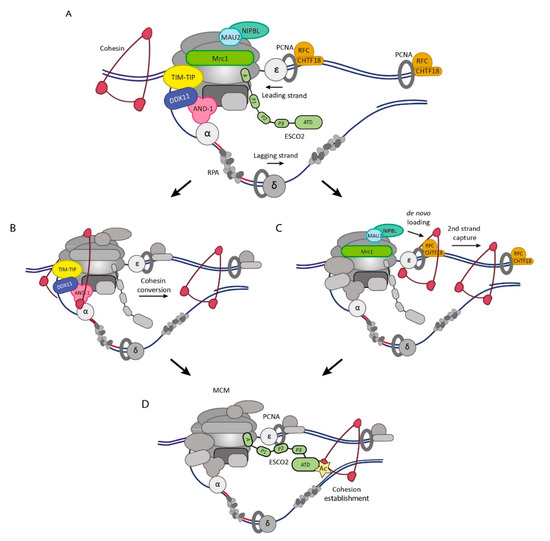 - Bender, D.; da Silva, E.M.L.; Chen, J.; Poss, A.M.; Gawey, L.; Rulon, Z.; Rankin, S. Multivalent interaction of ESCO2 with the replication machinery is required for sister chromatid cohesion in vertebrates. Proc. Natl. Acad. Sci. USA 2019, 117, 1081–1089. [Google Scholar] [CrossRef]