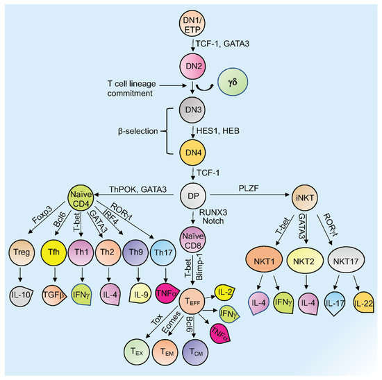 Overview of T cell development and differentiation. Schematic representation of thymopoiesis in mice. Following a series of DN (1–4) stages, DP cells develop into naïve CD4+, naïve CD8+, or natural killer T cells (NKT). Several transcription factors regulate this process. Different T cells secrete various cytokines to exert their activity. Signature transcription factors and cytokines designated to different cell types are shown. See the text for more details about each type of cell and their function (Tex= exhausted T cells; TEM = T effector memory T cells; TCM= T central memory T cells; TEFF = effector T cells; Th= T helper T cells; Tfh= T follicular helper T cells; Treg= regulatory T cells).