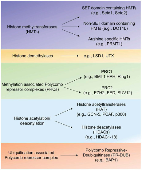 Post-translational epigenetic modifications of histone proteins including H2A, H2B, H3, and H4 are important for the regulation of gene expression [26,27]. Methylation, acetylation, and ubiquitination are major epigenetic marks on histones. Histone methyltransferases (HMTs) catalyze the transfer of methyl groups to lysine (K= lysine) and arginine (R= arginine) residues of histone (H3 and H4) proteins [27]. Trimethylation of lysine 4 of histone H3 (H3K4), lysine 36 (H3K36), and lysine 79 (H3K79) are found at active transcription sites [28]. On the other hand, methylated H3K9, H3K27, and H4K20 are transcriptional repressive marks [29]. In Figure 2, different HMTs, polycomb group (PcG) proteins that govern the K27 methylation, and histone demethylases are listed.