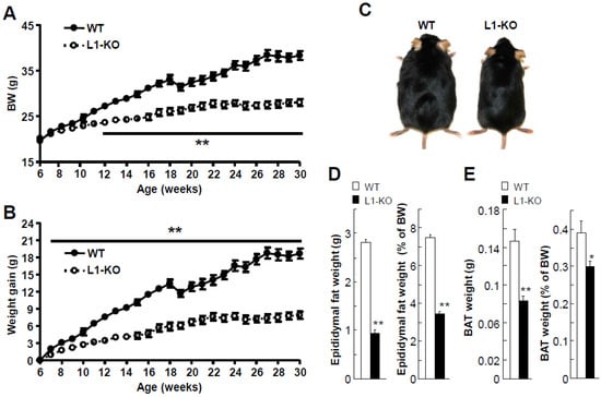 Reduced weight gain and fat tissue weights in L1-KO male mice fed the low-cholesterol (0.007%, w/w)-containing HFD: (A,B) body weight (BW) curves (A) and weight gain (B) during HFD feeding; (C–E) gross appearance of L1-KO mouse and WT littermate (C), epididymal fat pad weight and its ratio to BW (D), and interscapular BAT weight and its ratio to BW (E) after 24 weeks of HFD feeding. * p < 0.05, ** p < 0.001 (n = 6 in WT group vs. n = 8 in L1-KO group). The weight drop occurred during the transfer of mice from one building to the other.