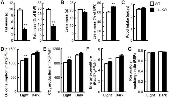 Reduced whole-body adiposity and increased energy expenditure in L1-KO mice fed the HFD for 23–25 weeks: (A,B) fat body mass and its ratio to BW (A) and lean body mass and its ratio to BW (B) in L1-KO mice (n = 10) and WT littermates (n = 9); (C–G) food intake (C), oxygen (O2) consumption (D), carbon dioxide (CO2) production (E), energy expenditure (F), and respiratory exchange ratio (RER) (G) in L1-KO mice (n = 15) and WT littermates (n = 12). * p < 0.01, ** p < 0.000001.