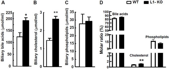 L1-KO mice have increased biliary concentrations of bile acids and cholesterol: (A–C) biliary concentrations of bile acids (A), cholesterol (B), and phospholipids (C) in the gallbladder bile of L1-KO and WT mice fed the HFD for 24 weeks; (D) molar ratios of biliary bile acids, cholesterol, and phospholipids calculated from the data shown in (A–C). * p < 0.05, ** p < 0.01 (n = 6–8).