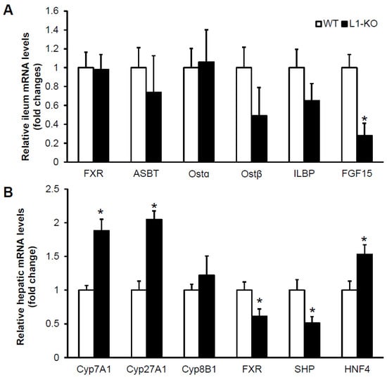 L1-KO mice have reduced ileal expression of FGF15 mRNA and increased hepatic expression of mRNAs for Cyp7A1 and Cyp27A1 after 6 weeks of HFD feeding: (A,B) relative mRNA levels in the distal ileum (A) and liver (B) of L1-KO mice and WT littermates measured by qPCR using individual total RNA samples in each group (n = 5). GAPDH and 18S RNAs were used as internal invariant controls for the ileum and liver, respectively. * p < 0.05.