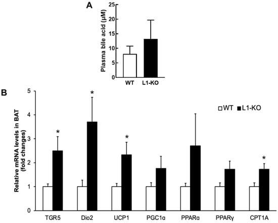 L1-KO mice have increased mRNA levels of genes involved in adaptive thermogenesis and fatty acid oxidation in BAT: (A) plasma concentrations of bile acids analyzed by UPLC–MS/MS in WT and L1-KO mice after 6 weeks of HDF feeding (n = 8); (B) relative mRNA levels in the interscapular BAT measured by qPCR with individual total RNA samples in each group (n = 5). For this study, 18S RNA was used as an internal invariant control. * p < 0.05.
