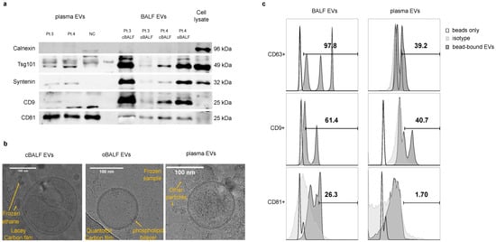 Figure 2 shows that the separation of EVs from both sources was effective. In Figure 2a, we can see that the exosomal markers Tsg101, CD9, CD81, and syntenin were detectable in both plasma-EVs and BALF-EVs. The non-EV marker calnexin is visible only in the cell lysate, which proves a good EV separation process and the lack of contaminating ER components. We checked the morphology of the separated EVs by cryo-TEM imaging (Figure 2b). In both BALF-EV samples, we found single round structures, comparing a clearly visible double-layer membrane with a thickness of 4 nm. The morphology and membrane thickness corresponded to the structures known as small EVs. Only a few such vesicles of 150 to 200 nm in size were visible per field, and only occasional clusters of EVs were seen. Most of the observed EVs were single EVs of a spherical shape. However, multi-vesicular particles with smaller double-membrane vesicles inside a bigger vesicle could also be observed such as in the presented cBALF-EV sample (Figure 2b). The much smaller, visible single-membrane dark irregular vesicles were not true vesicles, but frozen ethane as the solvent. In contrast, in the plasma-EV sample, there were many vesicles visible per field. However, only very few presented the typical size and double-membrane of true EVs. Most of the visible particles were single-layered, electron-dense, and had a smaller size than EVs (<50 nm). They mostly appeared in aggregates, and many of them displayed a typical striped inside structure. Based on previously reported cryo-TEM analyses of EV preparations, we concluded that these particles are lipoproteins and protein aggregates (especially the stripped structures, typical for lipoproteins; see also the cryo-TEM picture at smaller magnification in Figure S7b). Bead-assisted flow cytometry analysis of the presence of tetraspanin at the EV surface confirmed the results obtained by western blotting. BALF EVs captured by tetraspanin beads showed a higher percentage for all three exosomal markers (97.2% CD63, 61.4% CD9, and 26.3% CD81 positive particles) than plasma EVs (39.2% CD63, 40.7% CD9, and 1.7% CD81 positive particles). The supplementary data for gating strategy and flow cytometry analysis of the single bead type with BALF EVs are shown in Figure S2.