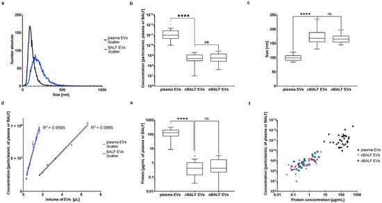 NTA of plasma and BALF EVs in scatter mode. (a) Distribution of number and size of detected particles in scatter mode of plasma and BALF-EVs. A representative NTA histogram of one patient is shown. (b) Mean concentration of EVs from plasma, cBALF, and oBALF for all patients. (c) Mode size of EVs from plasma, cBALF, and oBALF for all patients. (d) The concentration of particles measured in scatter mode depend on the volume of EV sample taken for the measurement. A line from simple linear regression with CI and R2 was plotted for both types of EVs. (e) Protein concentration calculated for one mL of plasma or BALF. (f) Correlation between the concentration of particles and protein concentration for plasma and BALF-EVs. Graphs (b,c,e) present a Tukey plot for all patients. **** refers to p value ≤ 0.0001, ns refers to p value > 0.05 from the Wilcoxon test-paired comparison (b,e) and t-test-paired comparison (c).