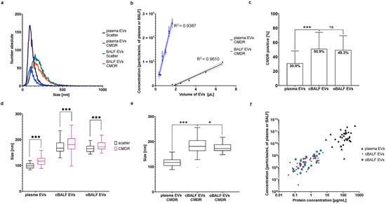 CMDR labeling of EVs. (a) Distribution of particles in scatter and fluorescent mode (640 nm) for EVs from plasma and cBALF. A representative NTA histogram of one patient is shown. (b) Concentration of particles measured in fluorescent mode (640 nm) depending on the volume of the EV sample taken to measure the BALF and plasma EVs of one patient. A line from simple linear regression with CI and R2 was plotted for both types of EVs. (c) The percent of CMDR-positive particles in comparison to all particles visible in scatter mode for all analyzed EV types. (d) Comparison of EV mode sizes measured in scatter and after CMDR labeling within the three analyzed EV types. (e) Comparison of the mode sizes measured after CMDR labeling of the three analyzed EV types. (f) Correlation between the concentration of particles and protein concentration for plasma and BALF-EVs after CMDR staining. Graph (c) presents mean and SD for all patients. Graphs (d,e) presents a Tukey plot for all patients. *** refers to p value ≤ 0.0002, * refers to p value ≤ 0.05, ns refers to p value > 0.05 from t-test-paired comparison.