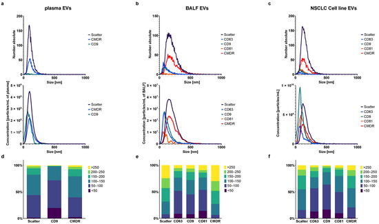 Size distributions from FL-NTA of particles in scatter and fluorescent mode (488, 640 nm) after immunolabeling of EVs against EV specific markers CD63, CD81, and CD9 and membrane marker CMDR. (a–c) Representative distributions measured in scatter and fluorescence mode of EVs from plasma (a), oBALF (b), and NSCLC cell line (c). The upper graphs present absolute numbers of particles measured by NTA, and the lower present the concentration of particles per one mL of plasma/BALF/NSCLC cell line EVs. The concentration of particles per one mL of each biological fluid is calculated by Particle Matrix software as Concentration = Number/(Area × depth). The component “Area x depth” differs between measures and is constant in the single measurement. Its value depends on outliers during each measurement. This “measured volume” effect leads to a different curve profile between the number absolute graphs and concentration graphs. (d–f) Concentration of particles—fraction of all particles [%] in six size fractions (<50 nm, 50–100 nm, 100–150 nm, 150–200 nm, 200–250 nm, >250 nm) for plasma (d), BALF (e) and cell line EVs (f). For all exact percent values, see Supplementary Table S4.