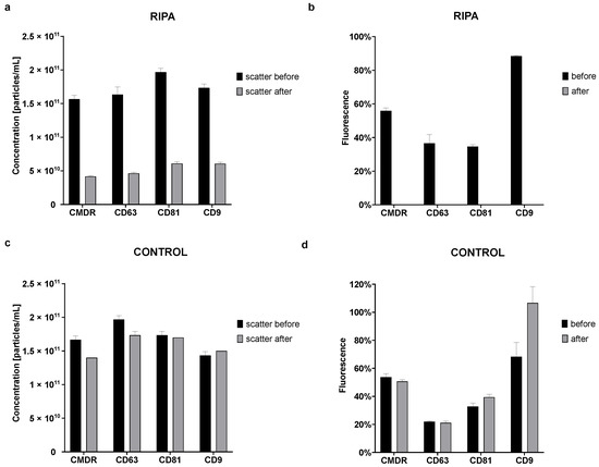 In contrast, for samples treated with PBS instead of RIPA (control), there was only a slight decrease after the treatment in scatter mode (the mean concentration in scatter mode before the treatment was 1.70 × 1011 ± 2.19 × 1010 particles/mL and after the treatment 1.58 × 1011 ± 1.60 × 1010 particles/mL) (Figure 7c). Control samples also remained fluorescent after the treatment. The overall difference in fluorescence for the control samples was only 2.94% for CMDR, 0.72% for CD63, and 6.67% for CD81. For unknown reasons, the fluorescence for CD9 increased by 38.33% after the treatment (Figure 7d). The sizes of the particles in both RIPA and the control samples remained the same before and after the treatment (Figure S6).
