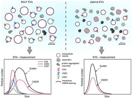 The following are available online at https://www.mdpi.com/article/10.3390/cells10123473/s1, Supplementary Table S1: Fluorescent label, antibodies, isotype controls, and secondary antibody used for NTA, flow cytometry, and western blot analysis; Supplementary Table S2: Concentration of particles for 1 mL of plasma/BALF in scatter, membrane, and tetraspanin labeling; Supplementary Table S3: Size of particles for 1 mL of plasma/BALF in scatter, membrane, and tetraspanin labeling; Supplementary Table S4: The concentration of particles—the fraction of all particles [%] in six size fractions (<50 nm, 50–100 nm, 100–150 nm, 150–200 nm, 200–250 nm, >250 nm) for plasma, BALF, and cell line EVs; Supplementary Table S5: Concentration of protein for 1 mL of plasma/BALF; Figure S1: EVs separation from plasma on SEC—particle/protein ratio; Figure S2: Flow cytometry analysis of oBALF-EVs bound to magnetic Dynabeads coated with antibodies against tetraspanins; Figure S3: Variability of the measured size and concentration of standard beads on NTA; Figure S4: Optimization of CMDR concentration; Figure S5: Antibody labeling of cBALF and oBALF EVs; Figure S6: RIPA lysis of EVs—size; Figure S7: Cryo-TEM images of thawed cBALF EVs; full blots from Figure S2a; Figure S8: Lipoprotein marker Apo-B; raw pictures from Cryo-TEM from Figure S2b.