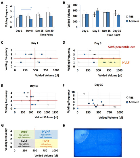 Voiding patterns of mice in the repeated low-dose of acrolein (acrolein mice) and control groups (PBS mice) were determined by filter paper assay (FPA) as previously described [19,20]. No significant differences in the voiding frequency and voided volume of acrolein vs. PBS mice were shown at days 1, 8, 15 and 30 pi (Figure 3A,B). The analysis of all datasets of voiding frequency and voided volume revealed no rejection of the hypothesis of normality from the PBS vs. acrolein group at each time point, with the exception of the 30-day pi PBS group. Though this one comparison appears to suggest a deviation from normality, this single event was considered to be an outlier and the hypothesis of normality accepted for that group as well. No significant effects were noted as determined by the repeated-measures two-way ANOVA. Notably, the voiding frequency of acrolein mice at day 8 pi was significantly lower than the voiding frequency of acrolein mice at day 1 pi. The voiding patterns of acrolein vs. PBS mice were categorized as low volume high frequency (LVHF), high volume high frequency (HVHF), low volume high frequency (LVHF) and high volume low frequency (HVLF) based on the 50th percentile cut (Figure 3C–G). On day 8 pi, a higher number of acrolein mice showed a HVLF voiding pattern as compared to PBS mice.