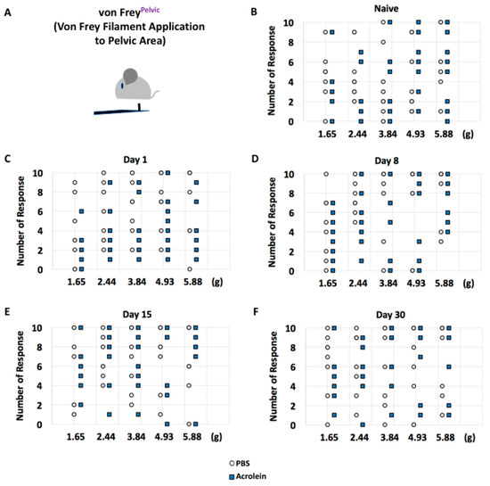 Assessment of abdominal withdrawal response to tactile stimulation in PBS vs. acrolein mice on the time points of naïve, days 1, 8, 15 and 30 pi as determined by von Frey application to the pelvic area. (A) Description of von Frey application to the pelvic area. The number of responses in response to an application of von Frey filament 1.65, 2.44, 3.84, 4.92 and 5.88 at naïve, days (B), 1 (C), 8 (D), 15 (E) and 30 (F) pi.