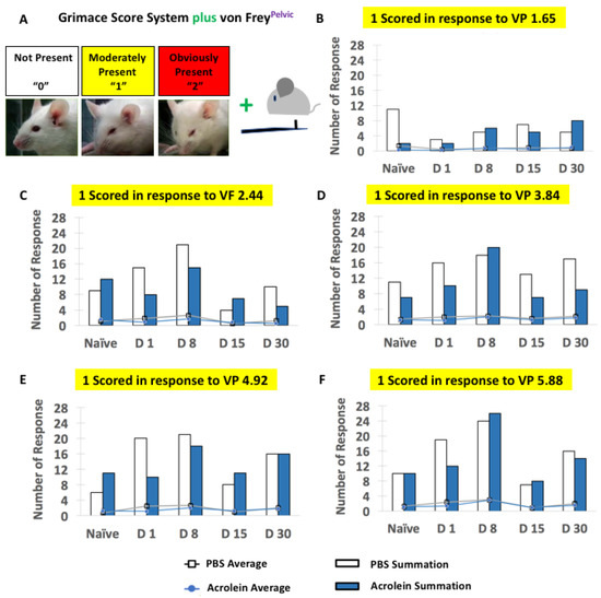 Concurrent assessment of the facial expression of pain and pelvic sensitivity shown in PBS vs. acrolein mice on the time points of naïve, days 1, 8, 15 and 30 pi as determined by the grimace scoring system and the application of von Frey filaments to the pelvic area. (A) Description of the grimace scoring system with a combination of the application of von Frey filaments to the pelvic area. The number of responses (bar graphs) and mice that scored 1 in response to the application of the von Frey filament were 1.65 (B), 2.44 (C), 3.84 (D), 4.92 (E) and 5.88 (F).