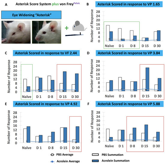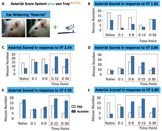 Concurrent assessment of the facial expression of pain and pelvic sensitivity shown in PBS vs. acrolein mice on the time points of naïve, days 1, 8, 15 and 30 pi as determined by the asterisk scoring system and von Frey application to the pelvic area. (A) Description of the asterisk scoring system with a combination of the application of von Frey filaments to pelvic area. The number of responses (bar graphs) and mice that scored an asterisk in response to the application of von Frey filaments 1.65 (B), 2.44 (C), 3.84 (D), 4.92 (E) and 5.88 (F).