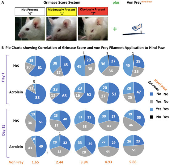 The experimental overview and results of the concurrent assessment of the tactile allodynia of the hind paw and grimace score are shown in Figure 8. At day 1 pi, a higher % of acrolein mice were scored a “1” or “2” by the grimace scale and were responsive to von Frey filament application to the hind paw as compared to a % of PBS mice (blue in pie chart, yes for grimace/yes for von Frey). Interestingly, this difference was not shown at day 15 pi.
