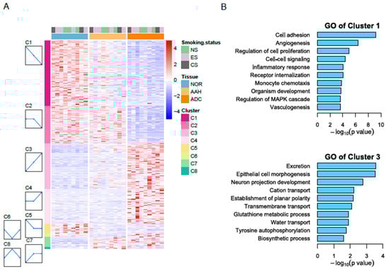 RNA-seq reveals differentially expressed genes in three tissue types. (A) Heatmap of differentially expressed genes in normal, AAH, and ADC tissues. Differentially expressed genes (DEGs) were grouped into eight clusters based on distinct gene expression profiles, namely C1 to C8. (B) Gene Ontology (GO) biological process results for Cluster 1 with decreasing pattern from normal to ADC (top) and for Cluster 3 with increasing pattern (bottom). AAH, atypical adenomatous hyperplasia; ADC, adenocarcinoma; CS, current smokers; ES, ex-smokers; NS, non-smokers.