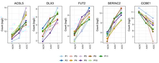 We identified five candidate genes that satisfied the stringent criteria for 1.2-fold change in all pairwise comparisons and across all patients (Figure S2, which shows a workflow for gene expression analysis). The expression of ACSL5, DLX3, FUT2, and SERINC2 gradually increased, while that of CCBE1 gradually decreased during lesion development (Figure 2 and Figure S2).