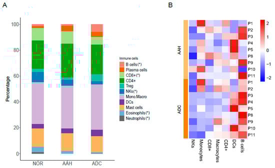 Immune cell signatures across different tissues and patients. (A) Proportion of immune cells in normal tissues, AAH, and ADC tissues. (*) indicates the significance test results (p-value < 0.05) in paired t-test of B cells (ADC vs. NOR), CD8+ (ADC vs. NOR), NKs (AAH vs. NOR, ADC vs. NOR, ADC vs. AAH), eosinophils (AAH vs. NOR, ADC vs. NOR, ADC vs. AAH) and neutrophils (AAH vs. NOR, ADC vs. NOR). (B) Relative differences expressed in z-score in tumor lesions compared to normal samples. AAH, atypical adenomatous hyperplasia; ADC, adenocarcinoma; NOR, normal.
