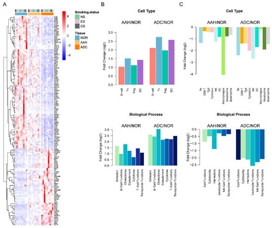 Immune signatures of differentially expressed genes (DEGs) in normal, AAH, and ADC tissues. (A) Heatmap of DEGs common in the PanCancer Panel. Samples are displayed in columns, while mRNAs are presented in rows. AAH, atypical adenomatous hyperplasia; ADC, adenocarcinoma; CS, current smokers; ES, ex-smokers; NOR, normal tissues; NS, non-smokers. (B) The average fold change of up-regulated DEGs in AAH and ADC compared to normal tissues grouped by immune cell types and Gene Ontology (GO) biological processes. (C) The average fold change in down-regulated DEGs in AAH and ADC tissues compared to normal tissue, grouped by immune cell types and GO biological processes.
