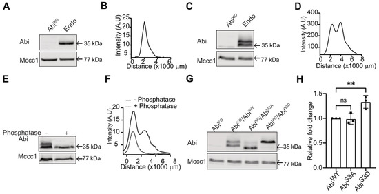 Multiple phosphorylations in Abi. (A) Western blot of Dictyostelium Abi using normal (0.3%) bis−acrylamide gels. Whole cells were lysed in sample buffer, boiled and separated on 10% bis−tris SDS-PAGE gels, blotted, and probed with an anti-Abi antibody, yielding a single band. Mccc1 is a loading control. (B) Line scan of Abi band signal intensity from normal gels shows a single peak. (C) Western blot of Abi using low (0.06%) bis-acrylamide gels, yielding two discrete bands. (D) Line scan of Abi bands’ signal intensities from low-bis gels shows clear separate peaks. (E,F) Phosphatase treatment. Whole Dictyostelium cells were lysed in TN/T buffer, then incubated with and without lambda phosphatase, boiled in sample buffer and analyzed using low-bis acrylamide gels. The scan shows two peaks resolved into one and shifted downwards after phosphatase treatment. (G) Unphosphorylatable (AbiS3A) and phosphomimetic triple (AbiS3D) mutations of serines S166/168/169 (S3) analysed by Western blotting on low-bis gels. Unphosphorylatable mutants run as a single, high-mobility band; phosphomimetic ones run as a single low-mobility band. These experiments were repeated three times. (H) Quantification of Abi expression in AbiWT, AbiS3A and AbiS3D cells. Abi expression was slightly increased in AbiS3D cells but was similar in AbiWT and AbiS3A cells. (n = 3, mean ± SD, ns = not significant, ** p = 0.0098, Dunnett’s multiple comparison test). KO; knock-out, Endo; endogenous.