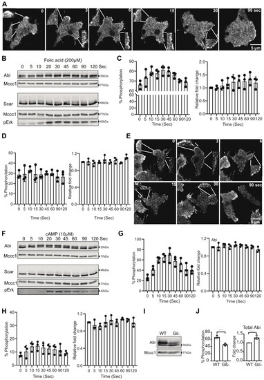 Previous studies have shown that extracellular signalling causes cytoskeletal changes and increases protrusions [25,26,27]. This is presumably mediated, in large part, through the Scar/WAVE complex. We have previously shown that phosphorylation of the Scar/WAVE subunit does not activate the complex, nor is it induced by chemoattractant signaling [13], and that the constitutive phosphorylation on the C-terminus of Scar/WAVE makes it less active [28]. In mammalian cells, Abi phosphorylation is thought to be mediated by MAP kinase signalling and by the nonreceptor tyrosine kinase Abl [7,12,14]. Dictyostelium lacks nonreceptor tyrosine kinases of the Abl family, and none of the phosphosites of Abi fit the MAP kinase consensus sequence (S/TP). Hence, we examined the changes in the Scar/WAVE redistribution and Scar and Abi phosphorylation in response to chemoattractant stimulus. Dictyostelium uses two principal chemoattractants: folate and cAMP, during growth and development, respectively. Treatment of growing cells with folate and developed cells with cAMP causes a rapid change in the amount of polymerized actin [18,29]. Brief exposure of cAMP has also been described to cause rapid recruitment of the Scar/WAVE complex to the cell periphery [30].